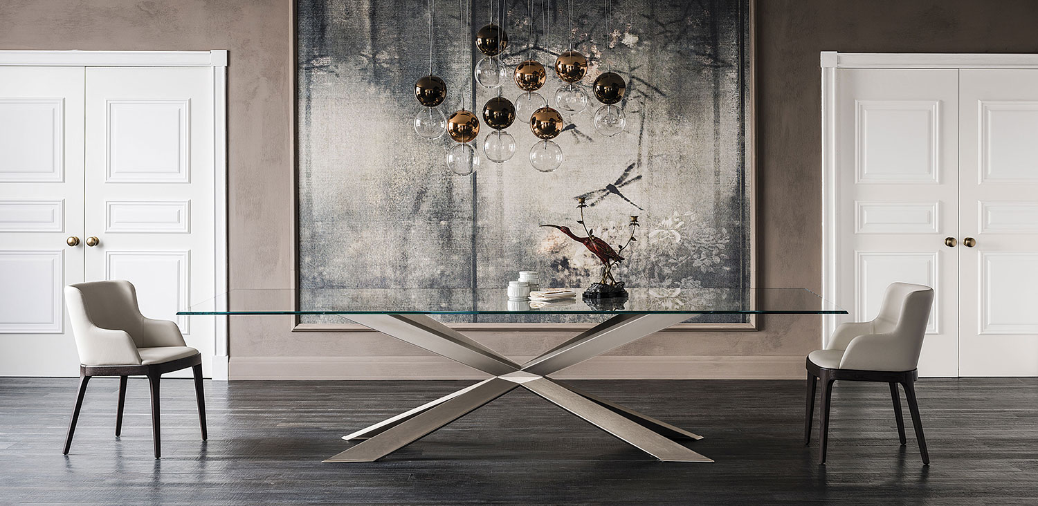Table with base in matt white (OP71), black (OP17) or graphite (OP69) painted steel, or in wheatered brass or polished stainless steel, or in satin bronze (15), satin titanium (11) painted steel, or with wooden base in Canaletto walnut (NC), dark Wenghè (W2) or Heritage oak (HR). Top in 15mm clear or extra clear glass,