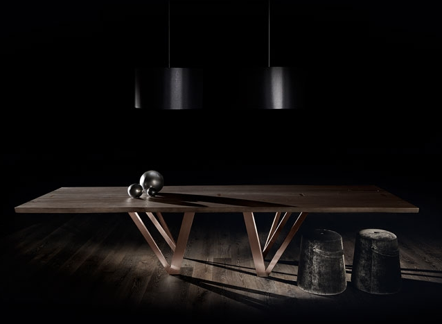 Прямоугольный обеденный стол на треугольных металлических ножках из коллекции Vero.Материалы: натуральное дерево (орех, дуб, глянцевый орех), металл.