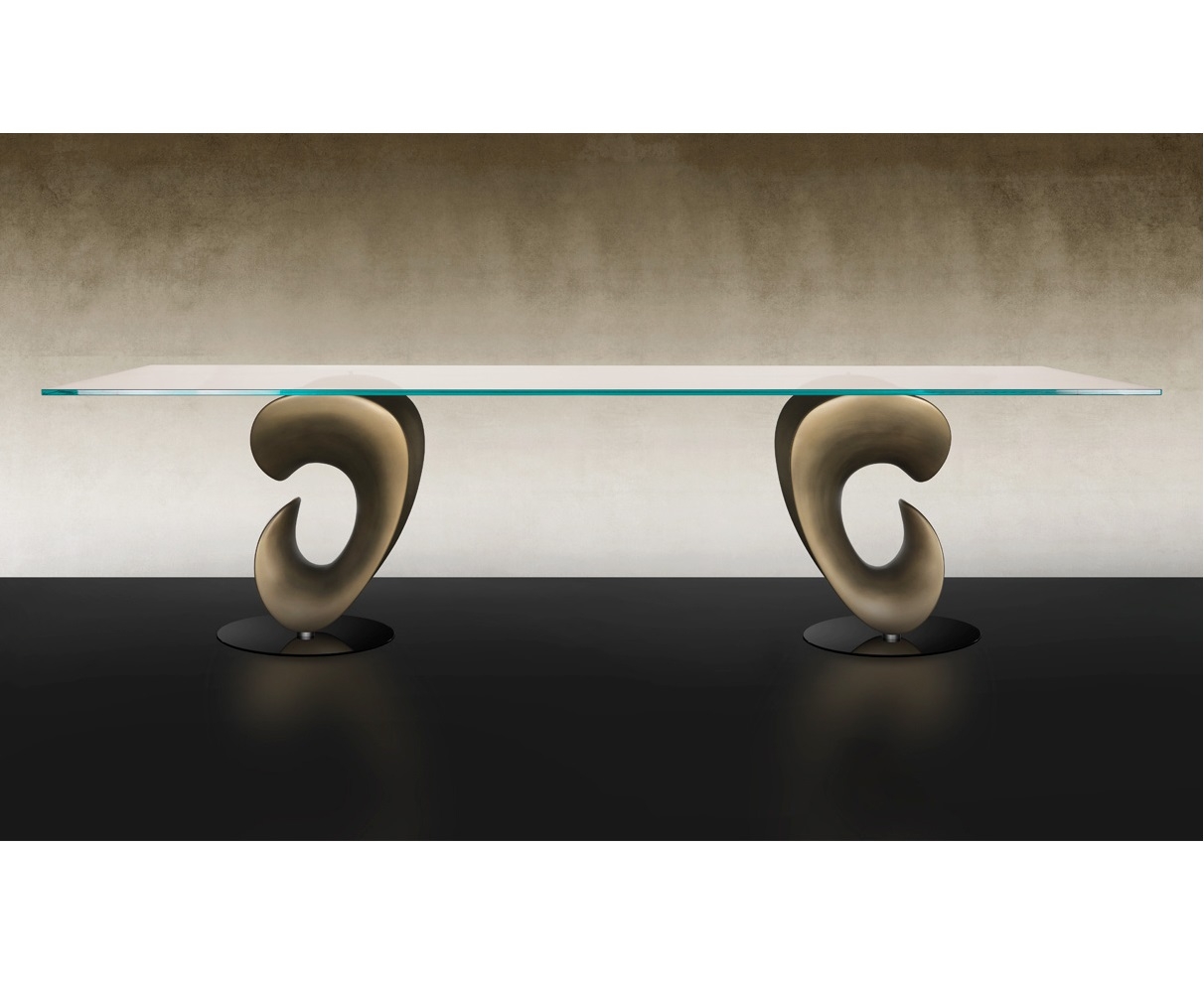 Dining table with bases in antiqued dark brass finish and plinth in smoked mirror glass. Top in 15mm thick transparent glass or extraclear glass or in Marble-glass.