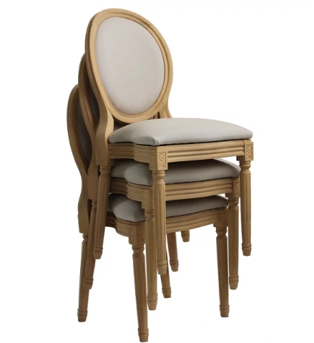 You can choose a padded backrest (as from the picture), a button-tufted padded backrest, or a back in cane. This model allows you to stack up to 5 chairs on top of one another.