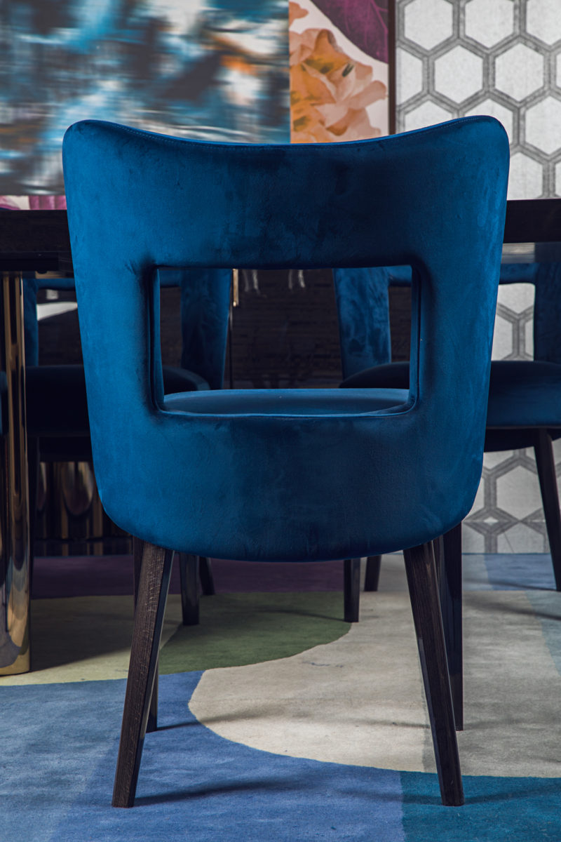 Model available in 40 finishes and 265 different coverings. Seat and backrest, with their trapezoidal shape, wink at the vintage design of the 50s. The retro allure of these two elements is renewed by an elegant game of full and empty spaces: a hole characterizes the backrest, softening its lines and giving the model a particular aesthetic lightness.