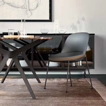 Chair with cold-foamed structure. Feet in black fi nish metal. Fixed cover in fabric, leather or ecoleather.
