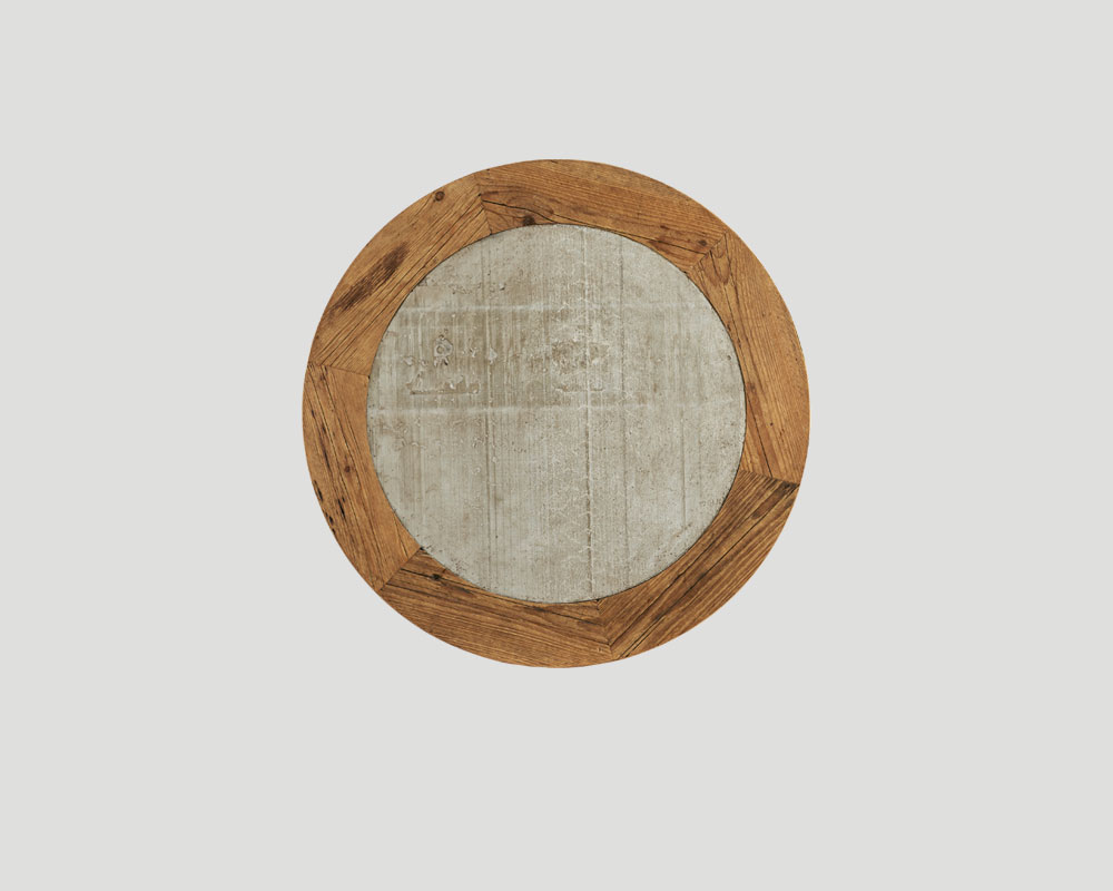Tavolo tondo in legno vecchio riciclato con base a cono, top con inserto effetto cemento