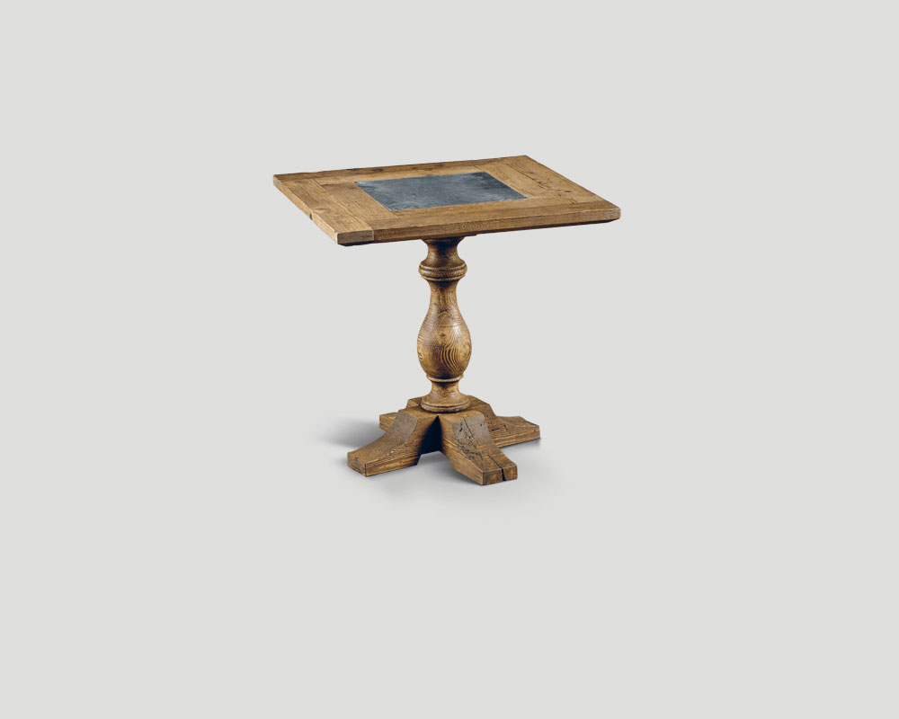 Tavolo quadrato in legno vecchio riciclato con base tornita, top con inserto in marmo Blue Stone