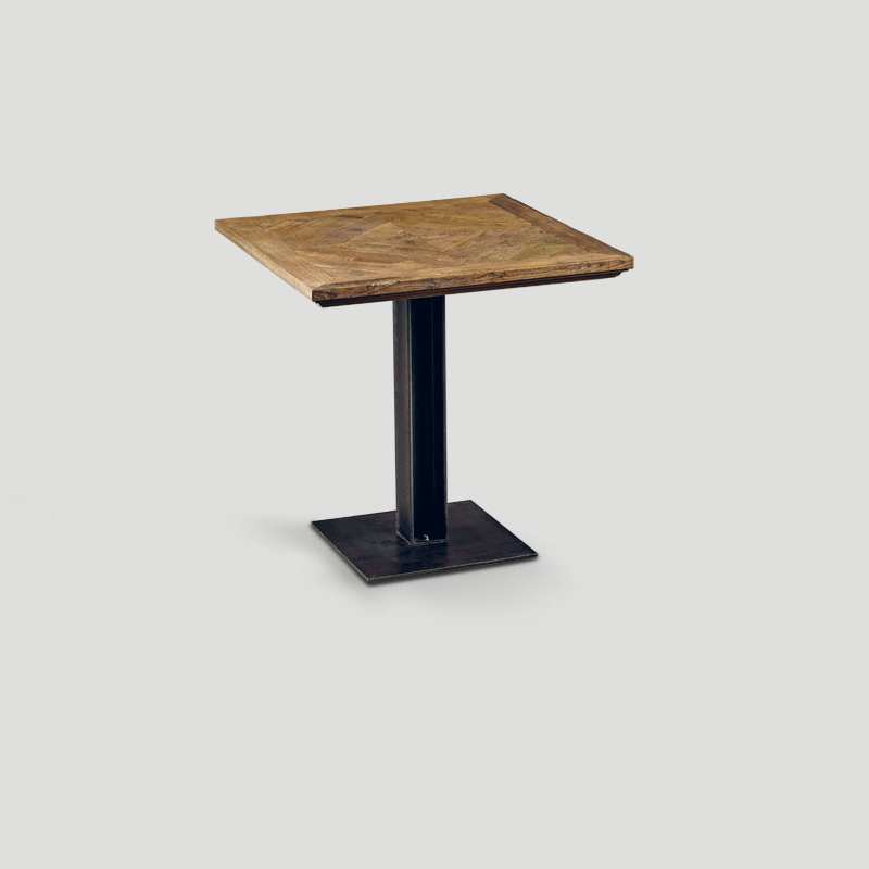 Tavolo quadrato in legno vecchio riciclato con base in metallo finitura Ferro Brunito, top a quadrotta finitura Naturale