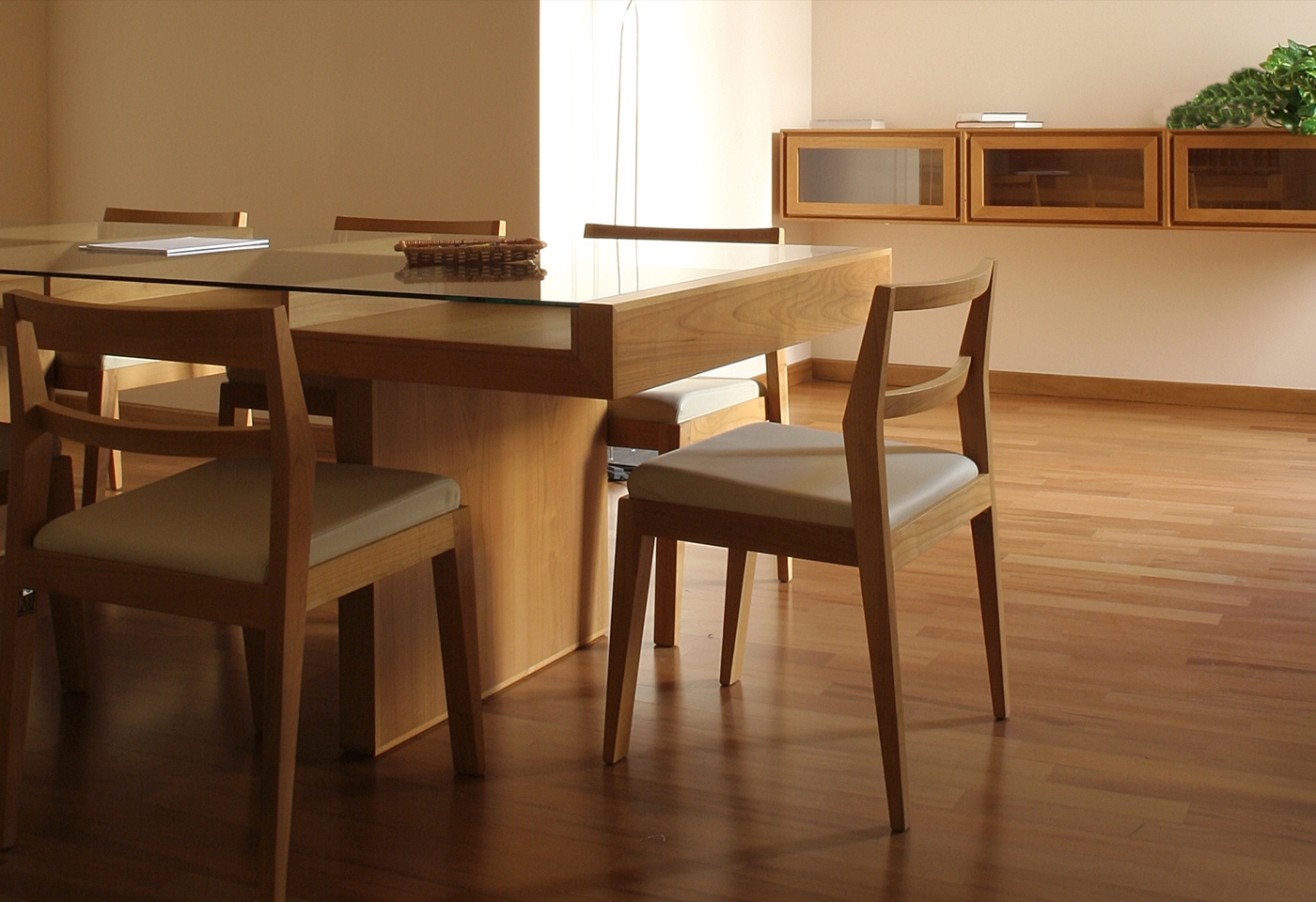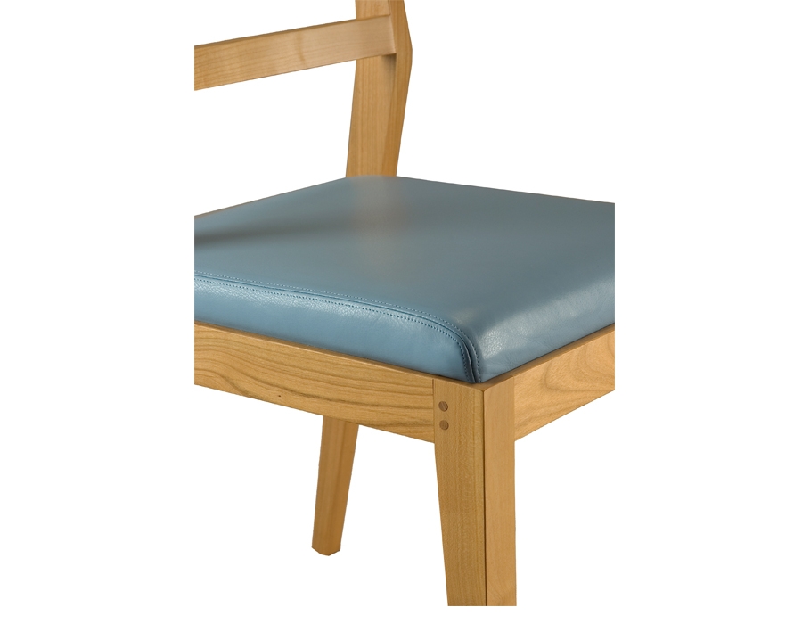 The Zero collection is composed of a series of products with simple lines, able to reflect craftsmanship in every piece. The pieces complete the collection of contemporary design and are the result of research on a wide range of home spaces. Stackable chair made of cherry wood with upholstered seat.