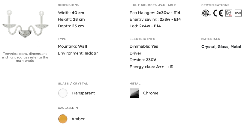 Wall lamp in crystal and glass, metal with chrome finish. Available in different dimensions and colours. Opera Classic Collection.