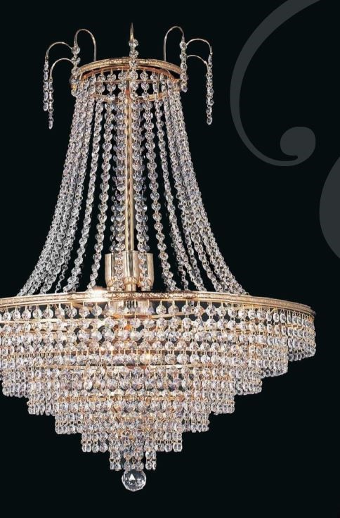 Lampadario Impero, telaio in metallo colore oro 24K ricoperto di listelli in vetro trasparente. Pendagli in cristallo trasparente.Empire Chandelier gold plated metal frame covered by transparent glass, Pendents in transparent Crystal