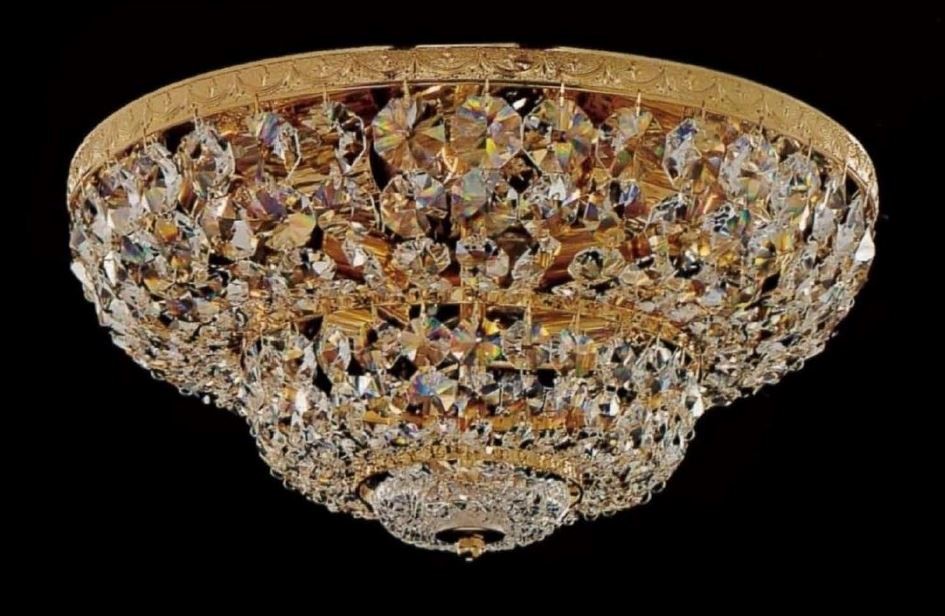 Plafoniera Impero, telaio in metallo colore oro 24K ricoperto di listelli in vetro trasparente. Pendagli in cristallo trasparente.Empire ceiling Chandelier gold plated metal frame covered by transparent glass, Pendents in transparent Crystal