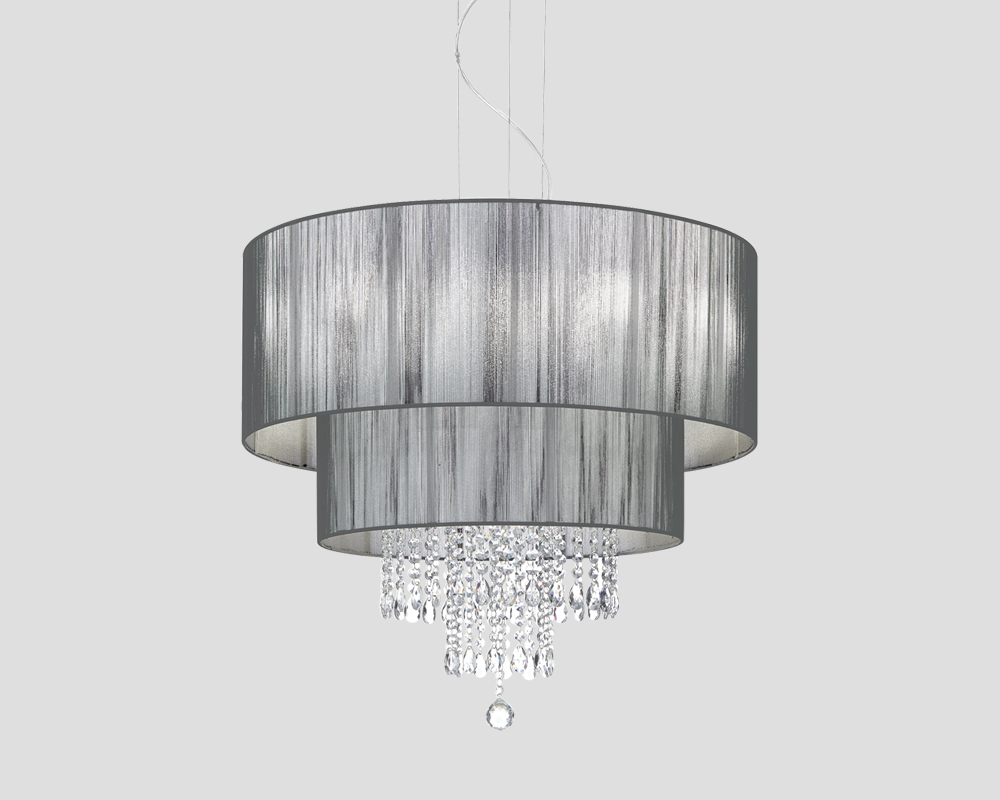 Lampadario 6 punti luce, in metallo con pendenti in cristallo e paralume in tessuto nero.