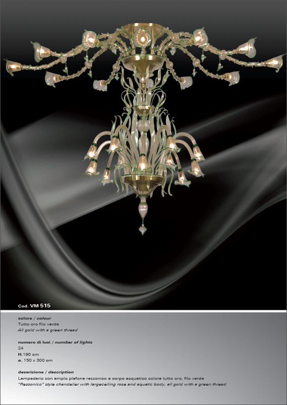Lampadario con ampio plafone rezzonico e corpo acquatico colore tutto oro, filo verde, 24 luci