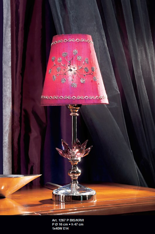Lampada con fiore cromo e cristallo ambra, paralume conico ricamato