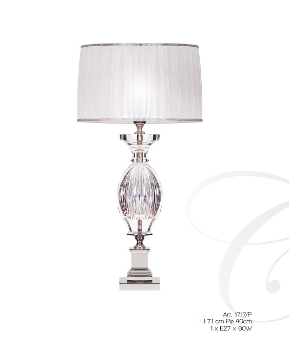 Lampada cromo in cristallo trasparente con paralume tondo a pieghe piatte in organza argentata all'esterno e in seta avorio all'interno.Table lamp with clear italin crystal.