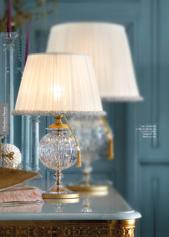 Lampada in cristallo fiorentino panciuta con paralume avorio e chiffon avorio all'esterno. Nappa non inclusa nel prezzo Nappa N. 30 Bianca e OroItalian Crystal table lamp with lampshade. Tassel not included in the price Nappa N. 30 Bianca e Oro