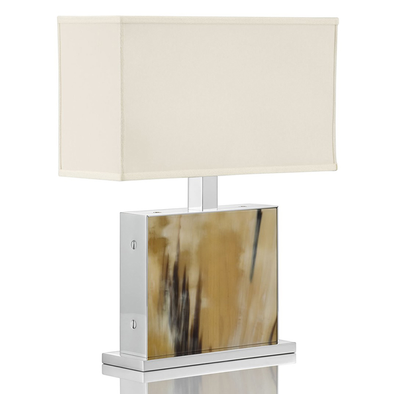 Lampada da tavolo in corno ed acciaio con viti a vista. Paralume in shantung colore avorio.