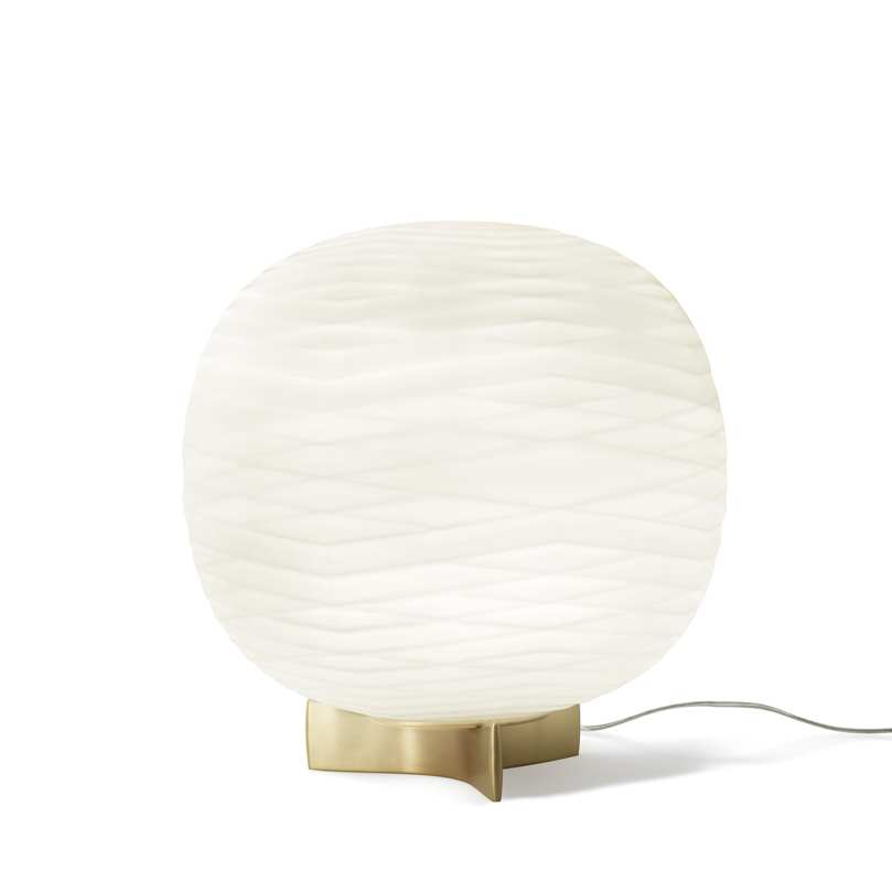 A fluid vibration on glass. The Gem table lamp is a seductive object that declares at first glance the superior value of the material and the fine craftsmanship of its manufacturing process. Unmistakable even when it is switched off, it has a satin gold coloured pedestal that enhances the hand-blown glass, allowing it to play the starring role.