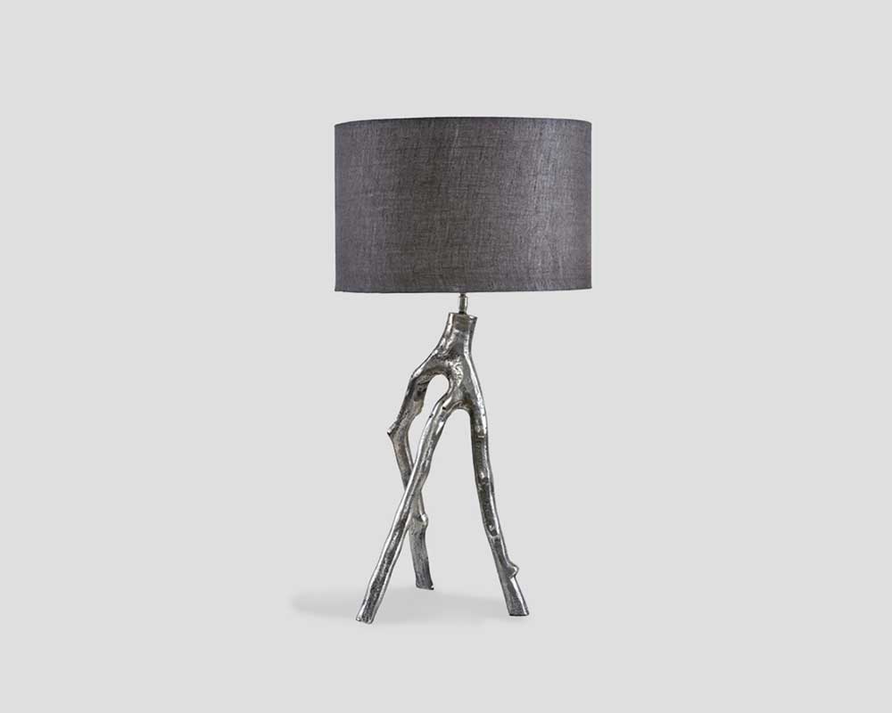 Lampada da tavolo in fusione di alluminio, finitura Britannium. Paralume tondo in tessuto Nero.
