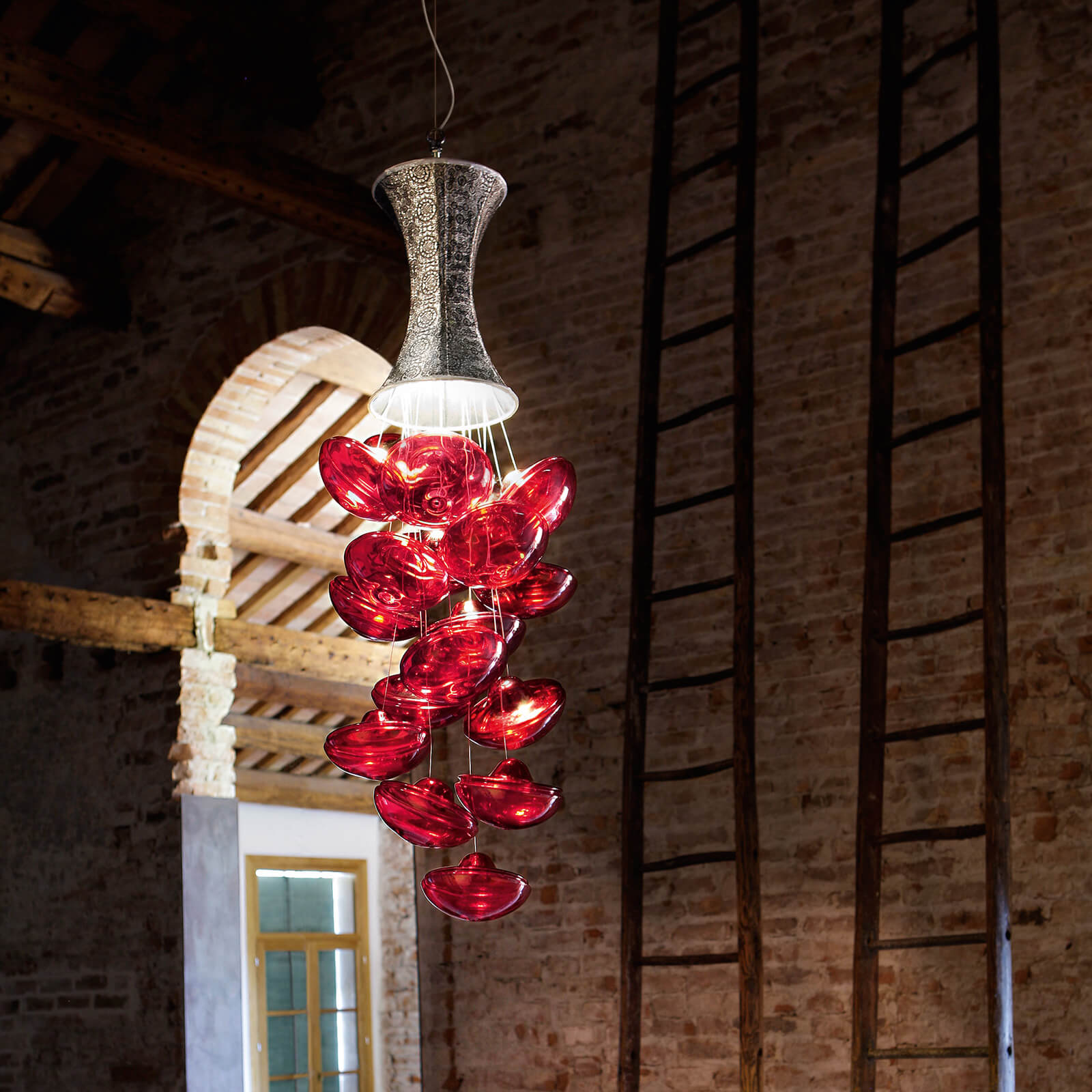 Pendant with decorated fabric diffuser and red blown glass pendants. Available in different colours. Incanto Modern Collection.