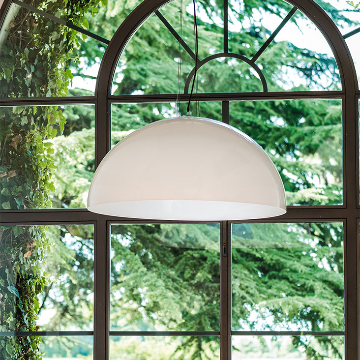 Потолочный светильник с абажуром из белого, черного или блестящего серебряного метакрилата.