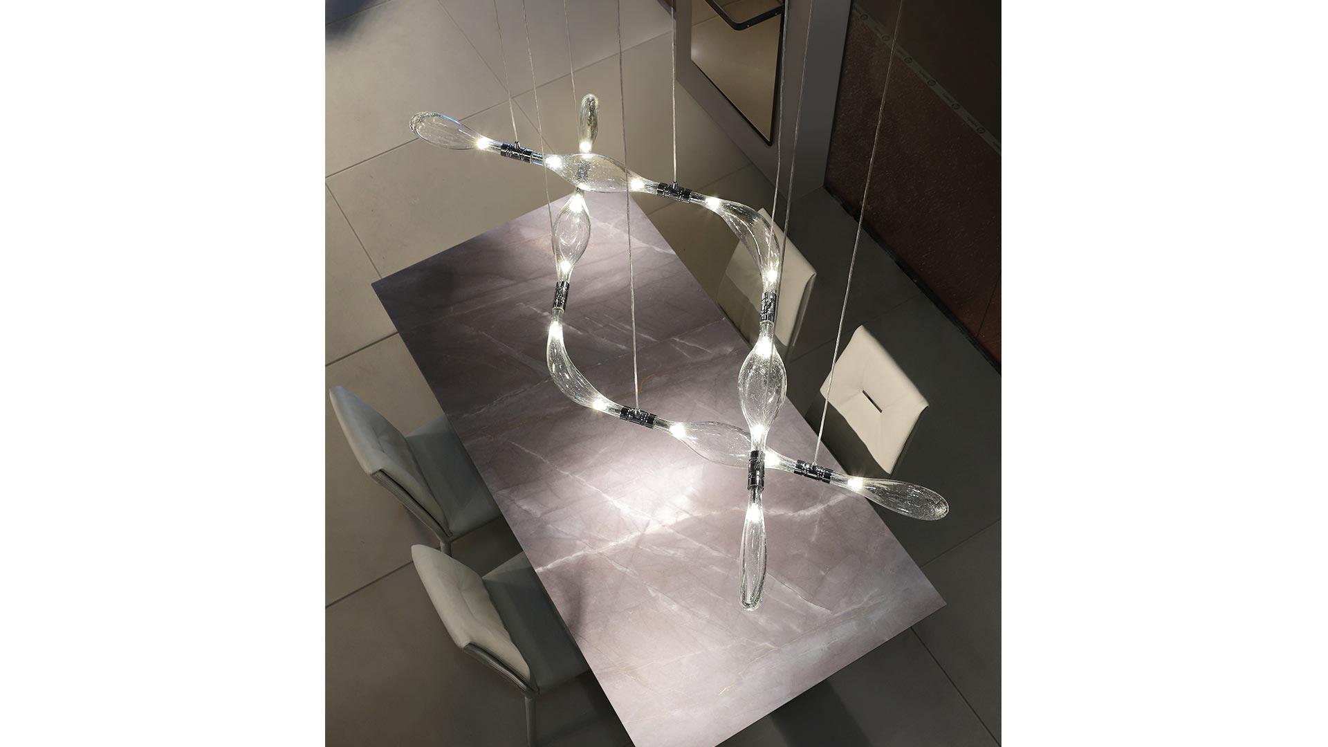 I moduli sono in vetro soffiato trasparente con bolle che si uniscono tramite un giunto in metallo cromato su cui sono inserite le lampadine a Led e il tirante elettrificato a sospensione.