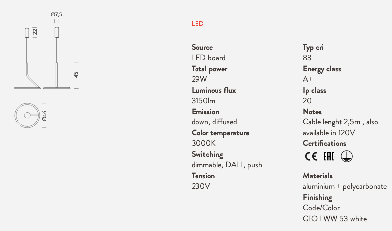Pendant and floor LED lamps, in aluminium painted in white, with opal polycarbonate diffuser for a widespread diffusion. Dimmable. DALI driver on request.