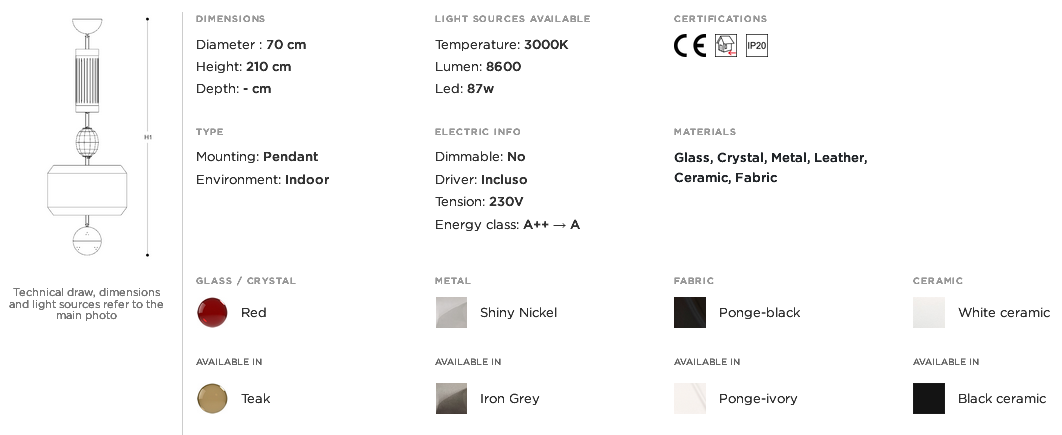 Pendant made of glass, metal, crystal, leather and ceramic elements with black fabric shade. Available in different dimensions and colours. Incanto Modern Collection.