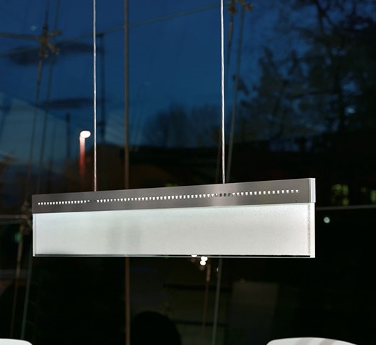 Suspension, table and wall lamps in extraclear bush-hammered 19mm thick glass with supports glazed inox steel. LED lighting system.