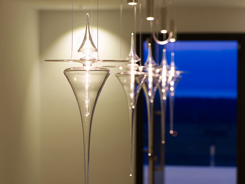 Suspended lamp with direct and reflected lights.The aluminum lamp body projects lower the light vertically through the glass. The distance between the light source and glasses can be varied to create a different lighting effect.
