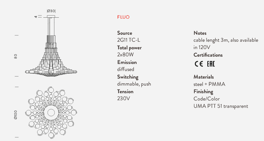 Very large pendant lamp, widespread light with steel structure and transparent metacrylate tubes, arranged according to a fractal model. Dimmable.