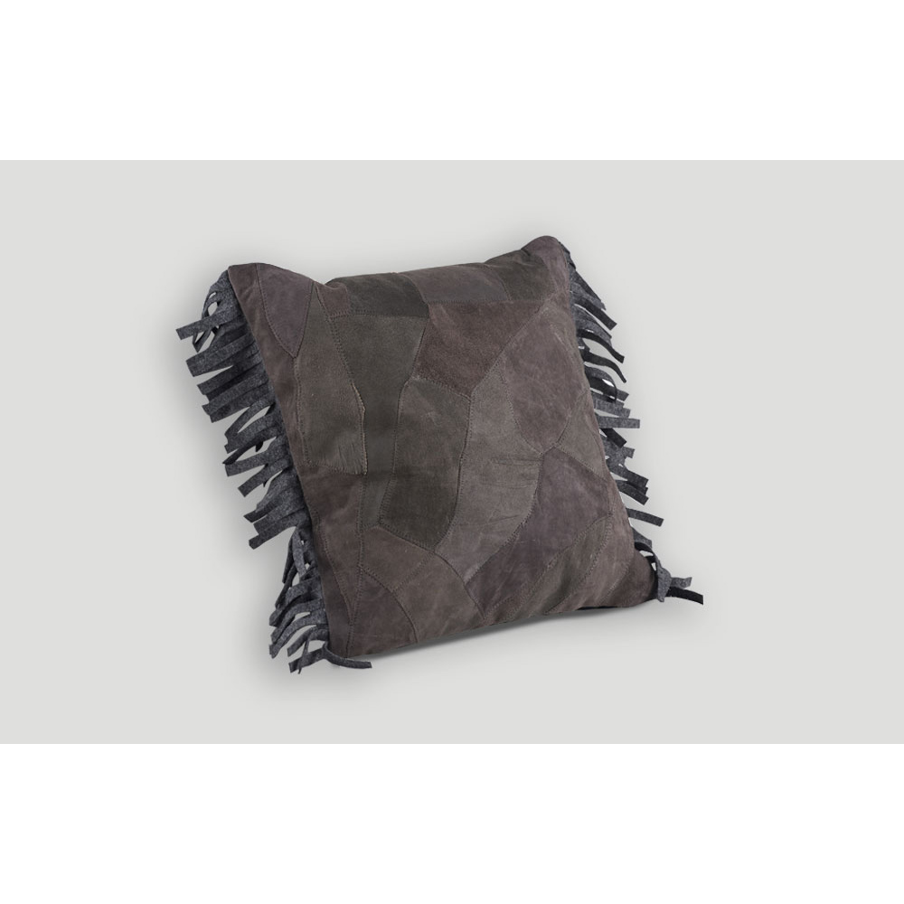 Cuscino con frange, lavorato a patchwork, in pelle riciclata color grigio scuro