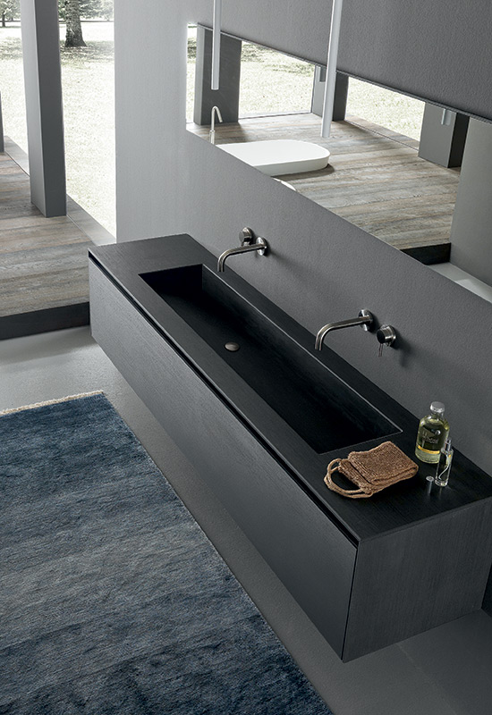 Nuovi volumi, elementi di tradizione, particolari che sottolineano l’evolversi del nuovo arredo bagno: il lavabo in appoggio, realizzato in massello di teak, si allontana dal passato per sposarsi armoniosamente con il piano in alluminio grafite. L’essenzialità del tratto a unico spessore (10 mm) consente di definire ambienti dall’elevato contenuto progettuale e dal design ricercato e contemporaneo.